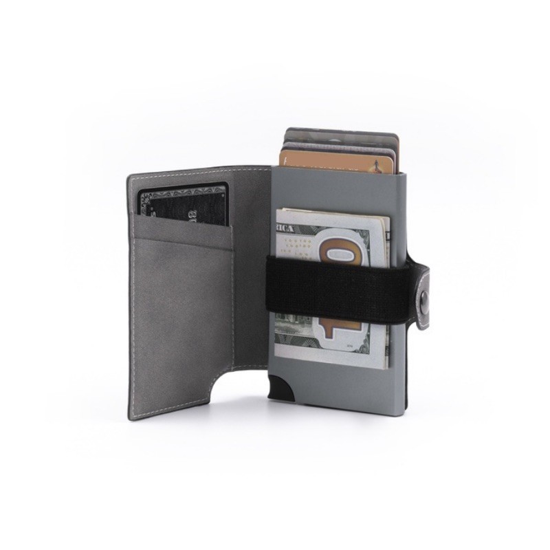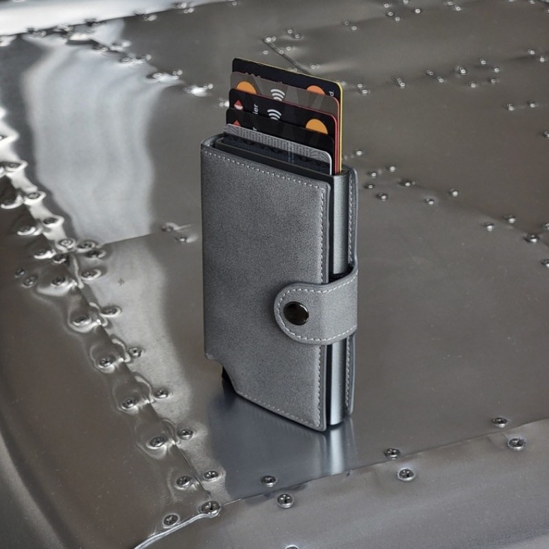 La Cartera Wally Porto cuenta con bloqueo RFID, que protege tus tarjetas contra lectores de RF o dispositivos antirrobo. Con un mecanismo de aluminio que protege tus tarjetas, esta cartera es fácil de usar. Simplemente aprieta el gatillo y tus tarjetas serán expulsadas al instante.
