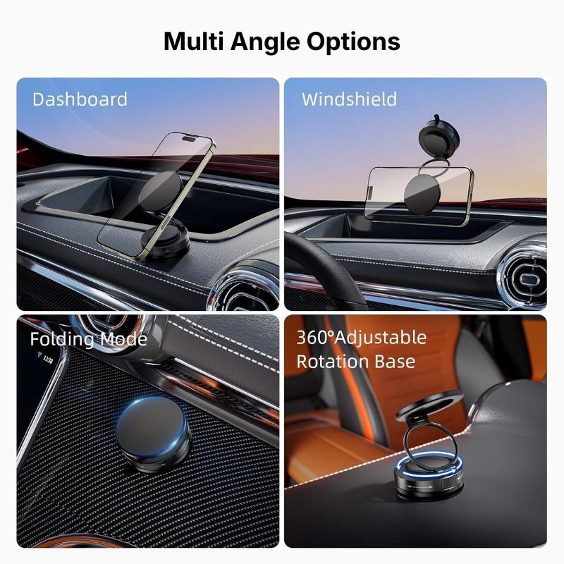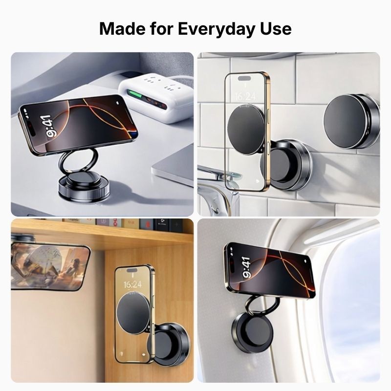 El soporte para smartphone con ventosa garantiza una sujeción firme en cualquier tipo de superficie, como salpicaderos de coches, mesas, espejos y otros lugares. Incluso con vibraciones, carreteras irregulares o movimientos rápidos, tu teléfono se mantendrá siempre en su sitio, sin caerse ni deslizarse.