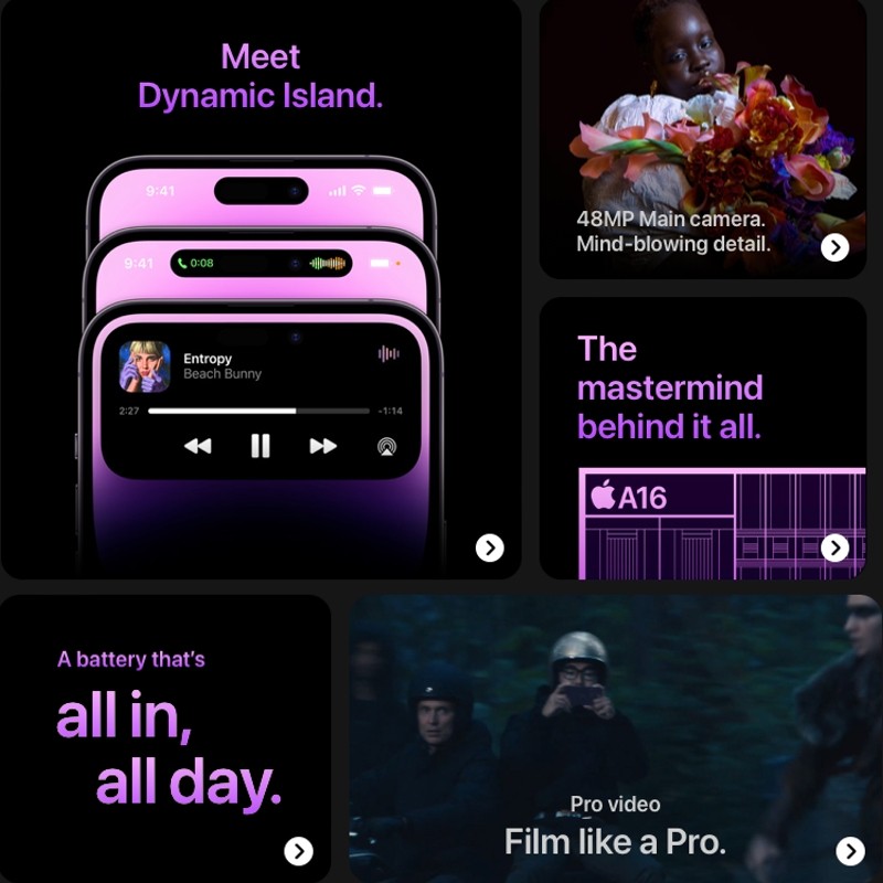 El iPhone 14 Pro fue el primer modelo de iPhone que dejó de lado la categoría superior, presentando Dynamic Island y con ello una nueva forma de interactuar con las notificaciones. Disponible en cuatro colores brillantes como Space Black, Gold, Silver y Dark Purple, tu nuevo iPhone será el centro de atención. Hablando de brillo, la pantalla Super Retina de 6,1 pulgadas es considerada una de las que mayor brillo transmite cuando se lance en 2022.