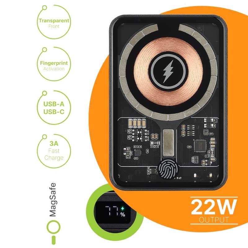 Con este cargador magsafe también podrás cargar cualquier dispositivo USB-C de forma segura gracias a la protección contra picos de corriente, alto voltaje o sobrecalentamiento. Al adquirir esta PowerBank MagSafe de 10000 mAh, también podrás elegir uno de los tres colores disponibles: negro, blanco o transparente.