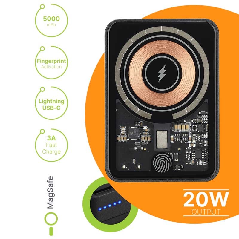 Con un diseño compacto y sencillo de usar, presentamos la Powerbank MagSafe para iPhone con activación Qi. Gracias al imán, la batería se fija a este accesorio de forma sencilla y sencilla. También es un gadget compatible con la tecnología MagSafe de Apple desde el iPhone 12 hasta los más recientes como el iPhone 15. Si tienes un iPhone antiguo y usas una funda MagSafe, simplemente toca este banco de energía y comenzará a cargarse automáticamente.